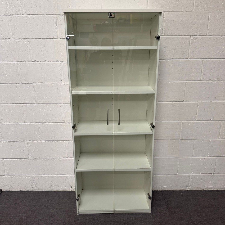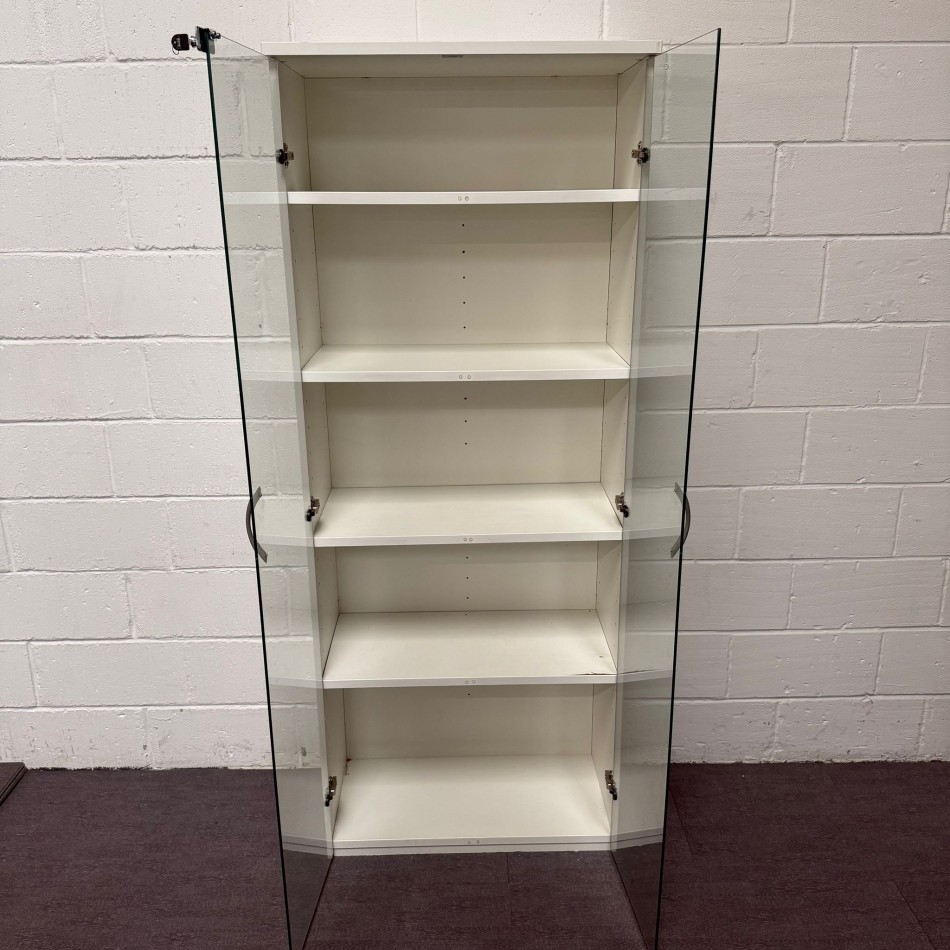 Type: Sleek white finish with glass doors. 2000mm high 4 shelf display cupboard . A modern style with a practical and versatile design