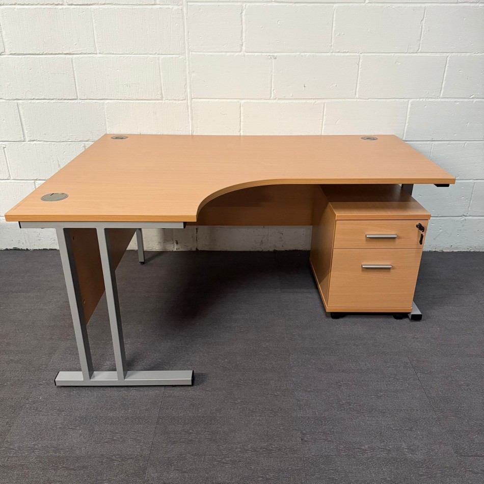 Spacious Beech Corner Desk with cantilever legs and a desk high pedestal- please advise if you prefer a mobile pedestal at time of ordering.